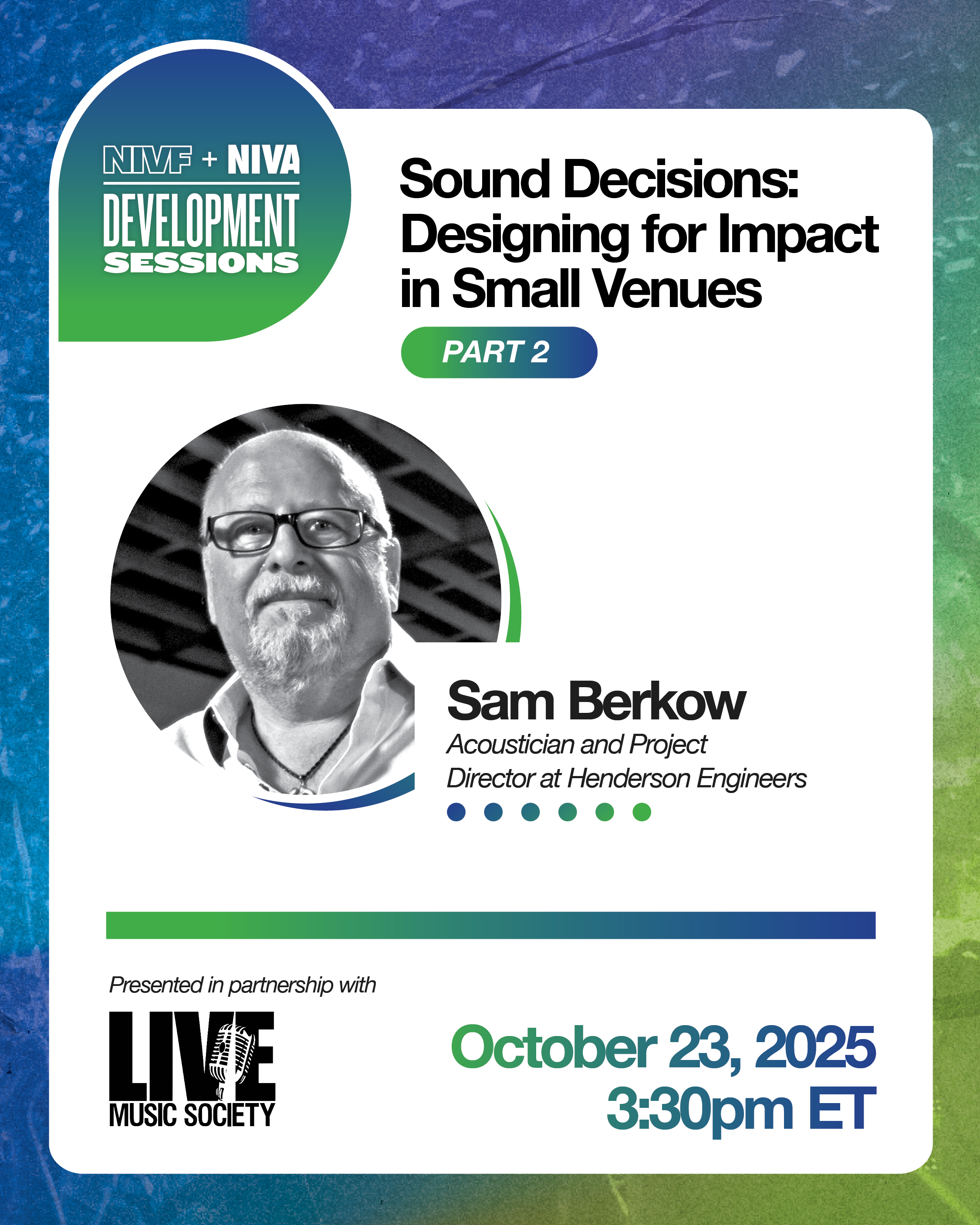 Join acoustician and project director Sam Berkow as he takes us deeper into practical strategies for improving sound in small and mid-sized venues. From budget-friendly fixes to long-term infrastructure planning, this session will offer valuable insights for venue operators, production teams, nonprofit leaders, and anyone passionate about creating intentional sound design that benefits artists, audiences, and communities.
