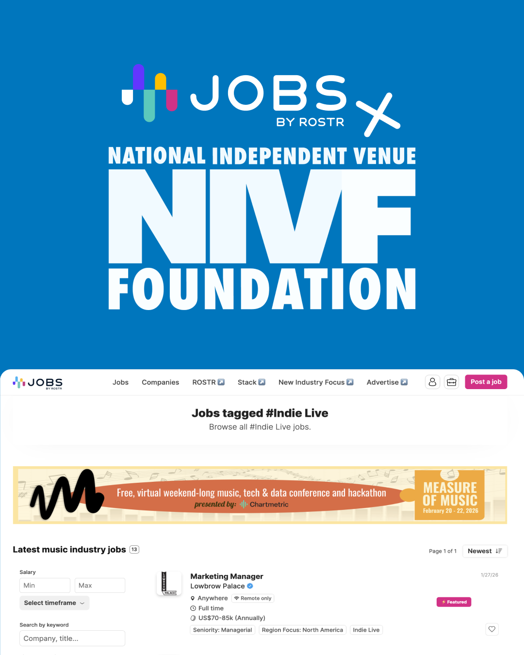 Starting Friday, Feb 20, NIVF’s job board will transition to ROSTR — featuring a dedicated Indie Live tag to make it easier to discover roles at independent venues, festivals and promoters across the country.